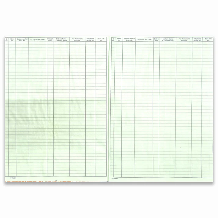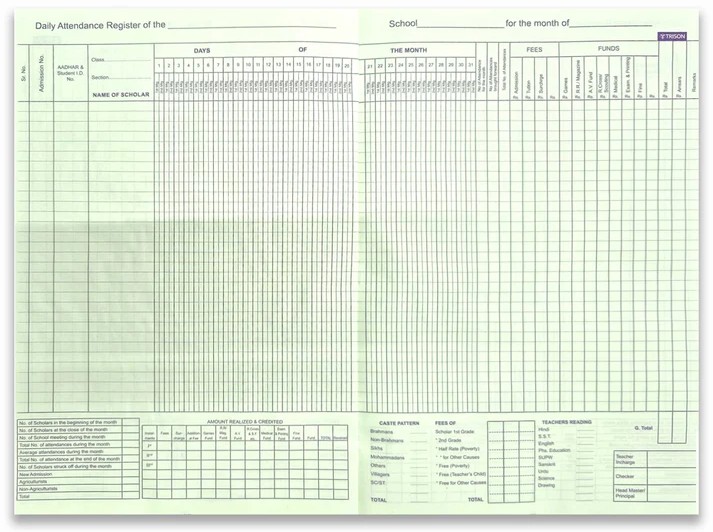 65 GSM green ledger paper| Dimensions: 19.5 x 32.5 cm Contains: 2 index + 24 attendance pages